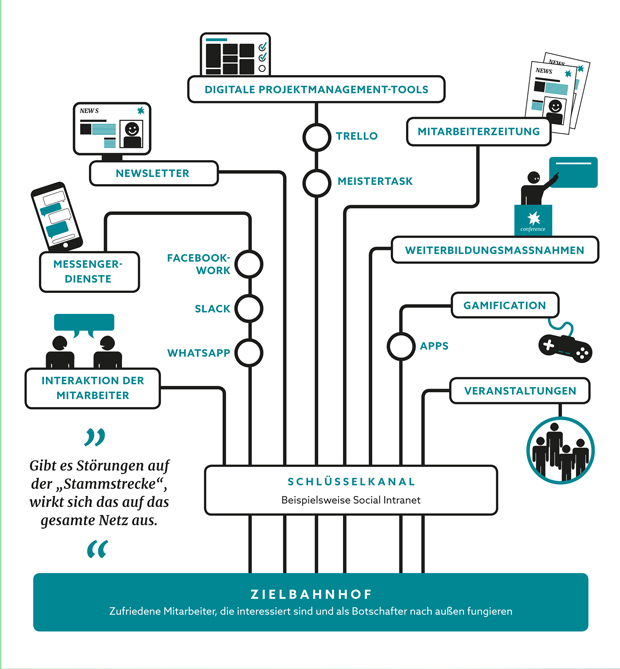 Das komplexe „Streckennetz“ der „Internen Kommunikation 4.0“, wie es die Münchner PR-Agentur Consense Communications sieht: die Mitarbeiterzeitschrift als ein analoger Kanal unter vielen – allerdings mit klaren Funktionen, wenn es beispielsweise um die Vermittlung vertiefender Inhalte geht. (Bild: Consense Communication)