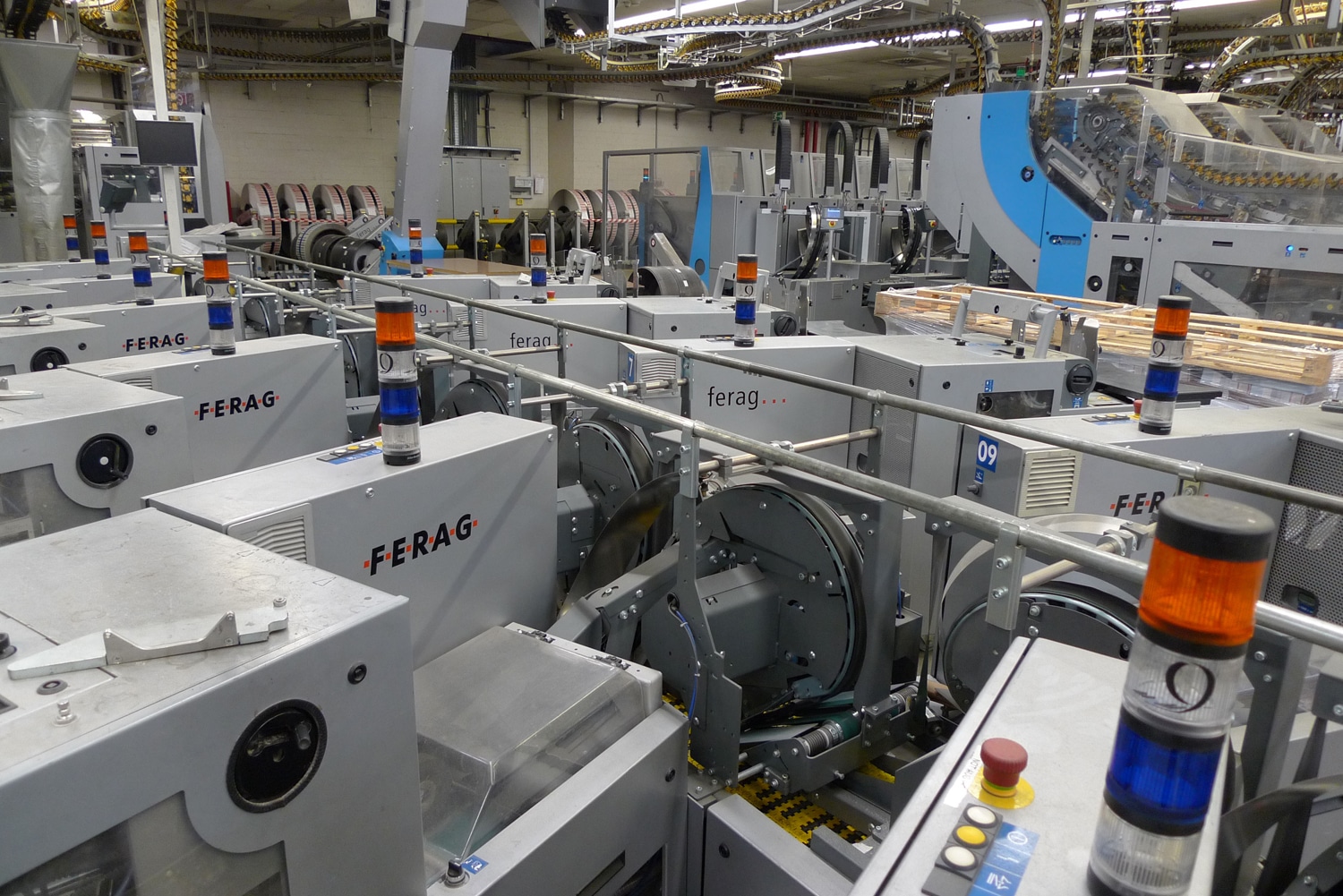 Der gesamte Maschinenpark in Essen und in Hagen war Anfang der 2000er-Jahre erneuert worden. Wegen der Produktionsstruktur konnte man nicht alle Linien auf einmal herausnehmen und neue aufstellen. So hatte sich der Wechsel auf die damals aktuelle Ferag-Weiterverarbeitungstechnik von 2003 bis 2012 hingezogen. Grundsätzlich sind alle Linien gleich ausgestattet: Eine MSD-Einstecktrommel, die jeweils direkt einer Rotation zugeordnet ist; dazu Wickeltechnik, Haupt- und Vorproduktanleger, Ferag RollStream für das Beilagen-Vorsammeln und am Ende je zwei MultiStack-Kreuzleger. Dazu verfügt man auch über die Ferag-Technik um Memo-Sticks aufzuspenden.