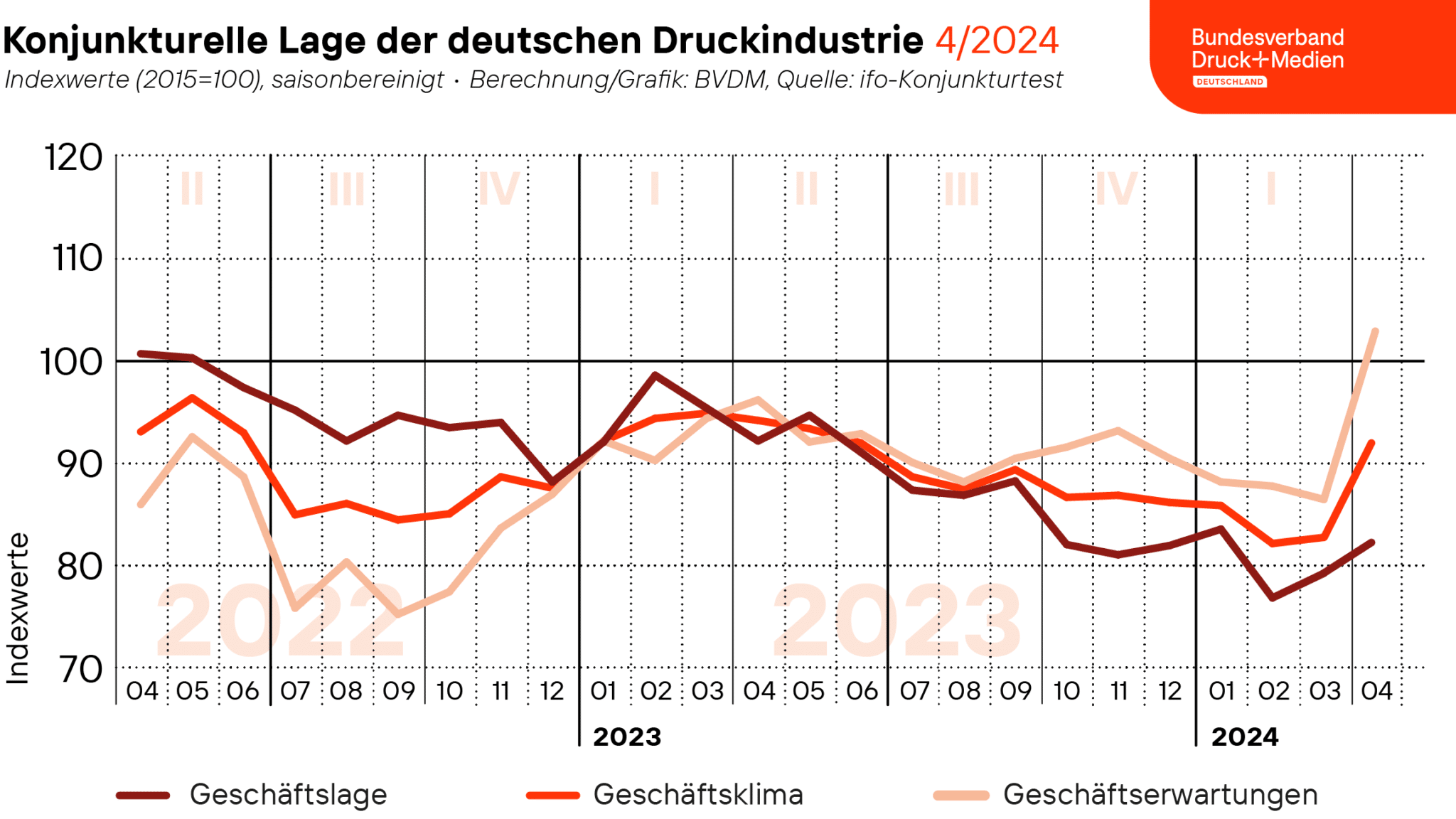 Im April 2024 bewerteten die vom ifo Institut befragten Entscheider der Druck- und Medienunternehmen ihre aktuelle Geschäftslage positiver als noch im Vormonat. Zudem verbesserte sich die Einschätzung der Entwicklung in den kommenden Monaten deutlich. Die Ausprägungen der aktuellen und erwarteten Geschäftslage bestimmen die Entwicklung des Geschäftsklimas, das einen guten Vorlaufindikator für die Produktionsentwicklung der Druck- und Medienindustrie darstellt.