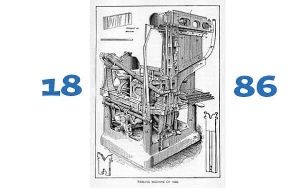 Mit dem "Blower" meldet Ottmar Mergenthaler (1854 - 1899) die erste funktionierende Matrizensetz- und Zeilengießmaschine (mit freiem Matrizenlauf) zum Patent an. Sie wurde bekannt unter dem Namen Linotype.