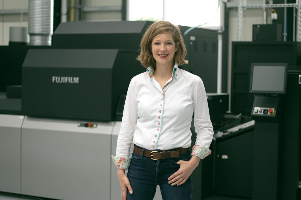 Geschäftsführerin Vera Goldschmidt vor der Fujifilm Jet Press 750S.(Bild: Fujifilm)