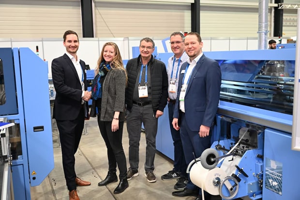 Von links: Pascal Ruch (Verkaufsleiter Müller Martini, Cilgia Gremper (CEO Gremper AG), Karl Gremper (Verwaltungsratspräsident Gremper AG), Marcel Hamburger (Produktionsleiter Gremper AG) und Georg Riva (Vertriebsverantwortlicher für den Schweizer Markt Müller Martini) vor dem Vareo Pro an den Hunkeler Innovationdays in Luzern.(Bild: Müller Martini)