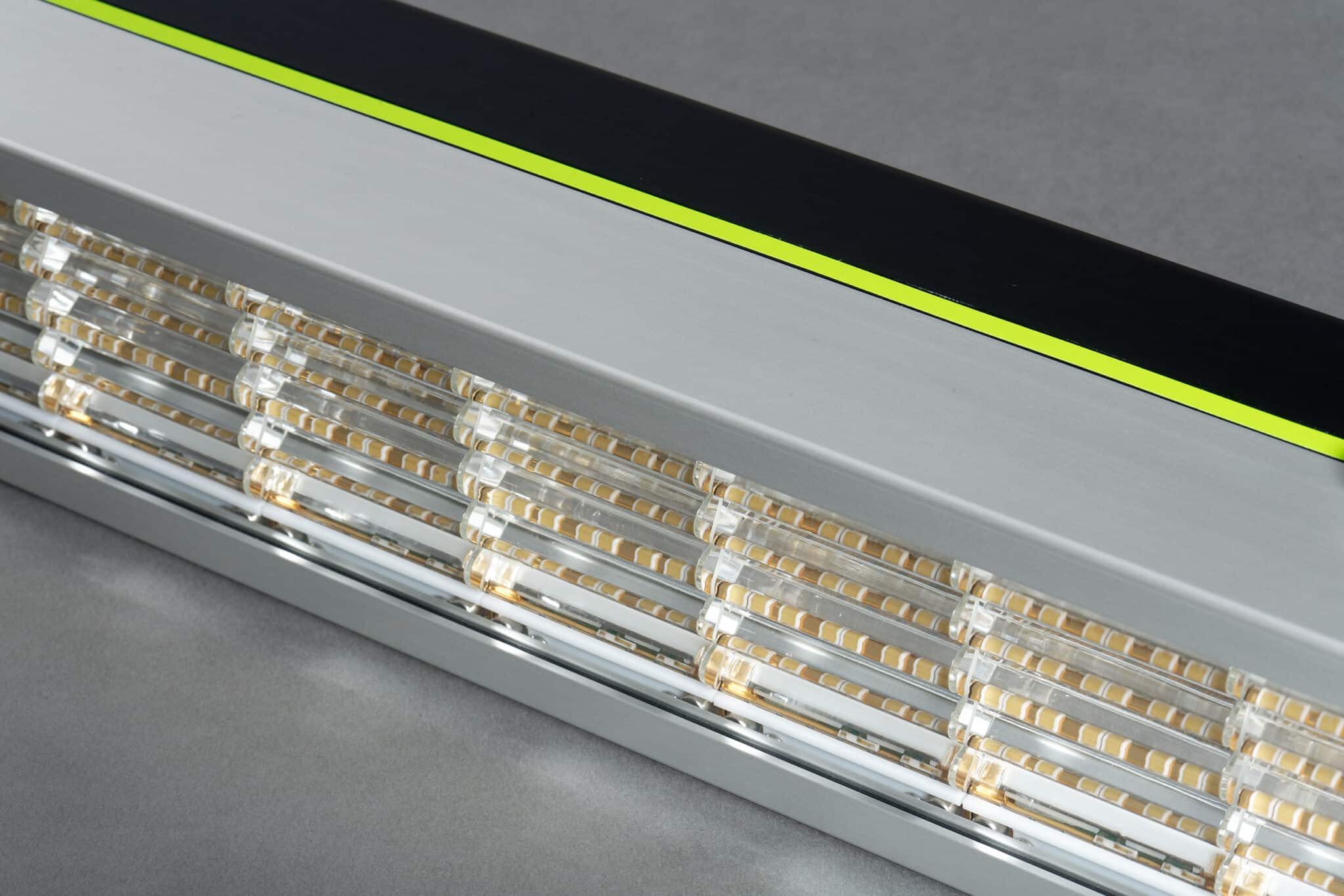 Die LED-UV-Aggregate der LEDcure-Reihe basieren auf einem modularen Grundkonzept in Kombination mit einer kompakten Bauform und sollen so Flexibilität und vielseitige Einsetzbarkeit ermöglichen. Das System ist in der Länge frei skalierbar und kann laut IST Metz an alle Maschinenformate und Einbausituationen angepasst werden. Damit ist der Einsatz eines LEDcure-Aggregats an verschiedenen Positionen einer Maschine möglich. “XT8 Booster” nennt IST Metz die Technologie, dank der LEDcure über bis zu 30% mehr Leistung als andere am Markt verfügbare LED-Systeme verfüge. Bei LEDcure sei außerdem ein simpler Austausch der Optik sowie die Möglichkeit zum nachträglichen Upgrade der LED-Chips möglich. IST LEDcure Systeme sind sowohl als Nahfeldsysteme (ohne Optik) als auch als mit einer speziellen Optik zur effektiven Härtung auch bei entfernten Objekten (bis ca. 100 mm) lieferbar.