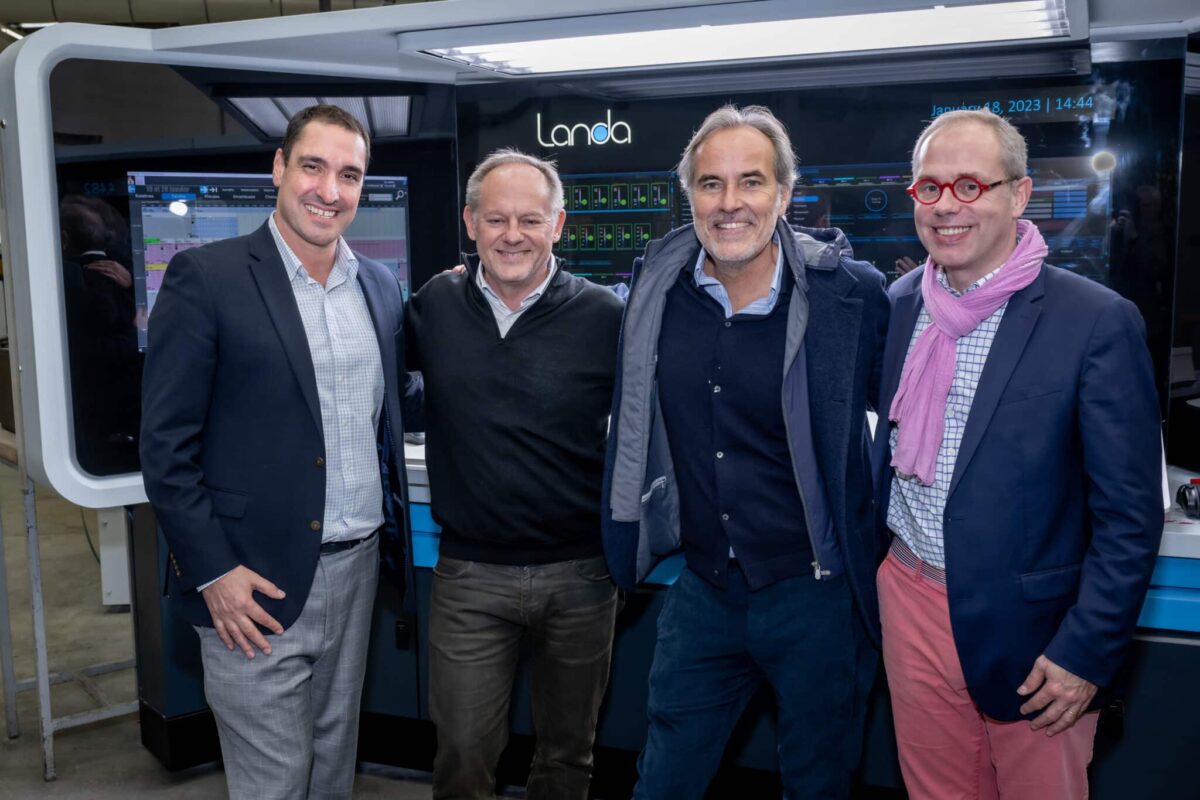 Bei der Groupe Prenant wird die Nanografie nicht als Konkurrenz sondern als Ergänzung zum Offset verstanden: (v.l.n.r.) Sharon Cohen (Chief Business Officer, Landa Digital Printing), Philippe Vanheste (Dep. General Manager, Groupe Prenant), Laurent Prenant (Président, Groupe Prenant) und Jean Baptiste Bardinet (Global Segment Manager Commercial and Publishing Market, Landa Digital Printing). (Bild: Landa Digital Printing)