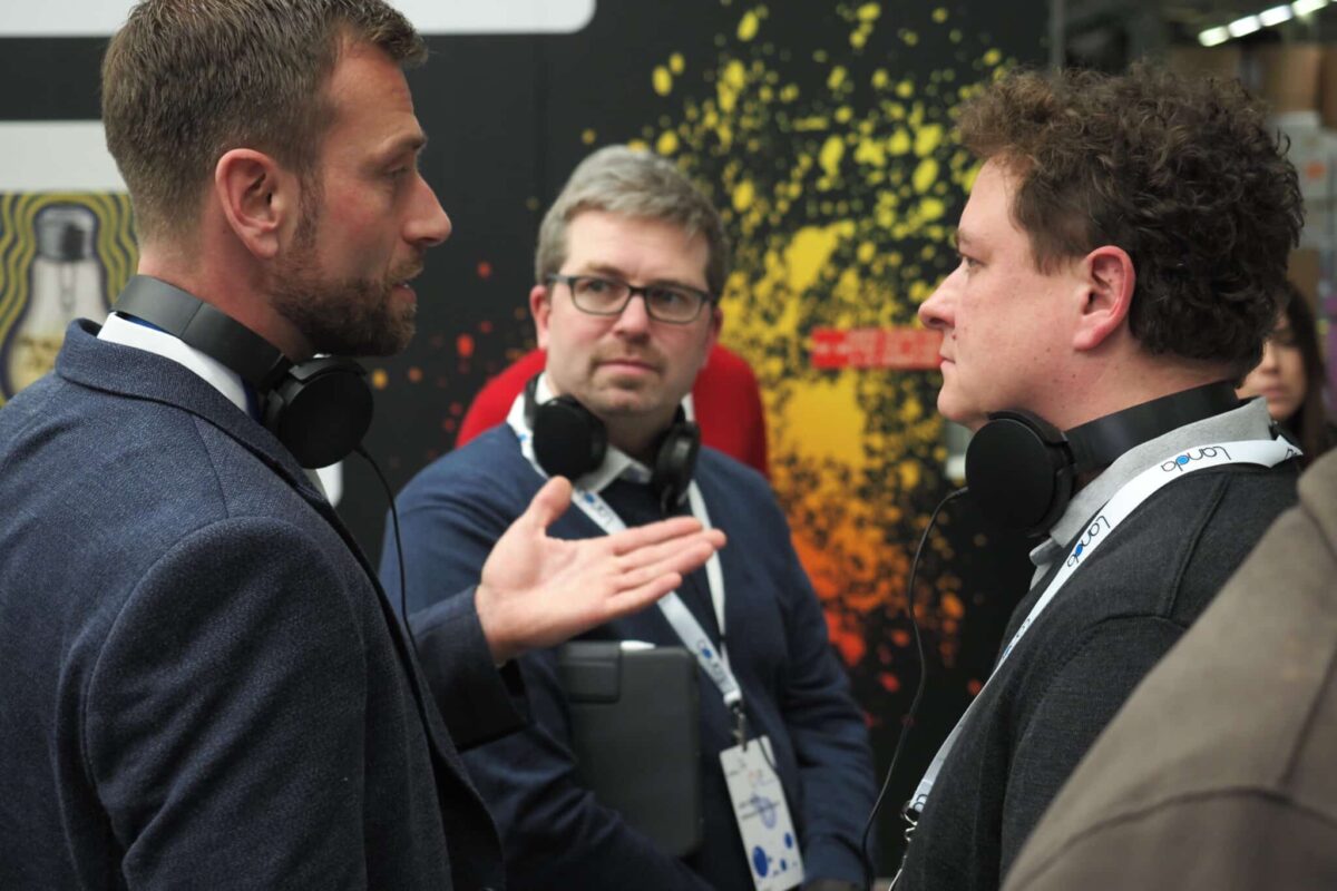 Benjamin Bösch, Regional Sales Manager D-A-CH bei Landa Digital Printing, im Gespräch mit Besuchern aus Deutschland. (Bild: Gerd Bergmann)