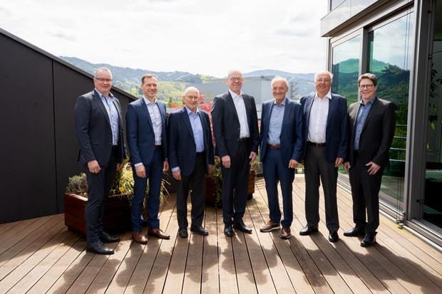 Dr. Bernd Eikens (Abbildung Mitte) wurde am 29. April 2024 als ordentliches Mitglied des Auf-sichtsrats der Koehler-Gruppe gewählt. Fritz Holzhey (dritter von links) verlässt den Aufsichtsrat nach elf Jahren.(Bild: Koehler-Gruppe)
