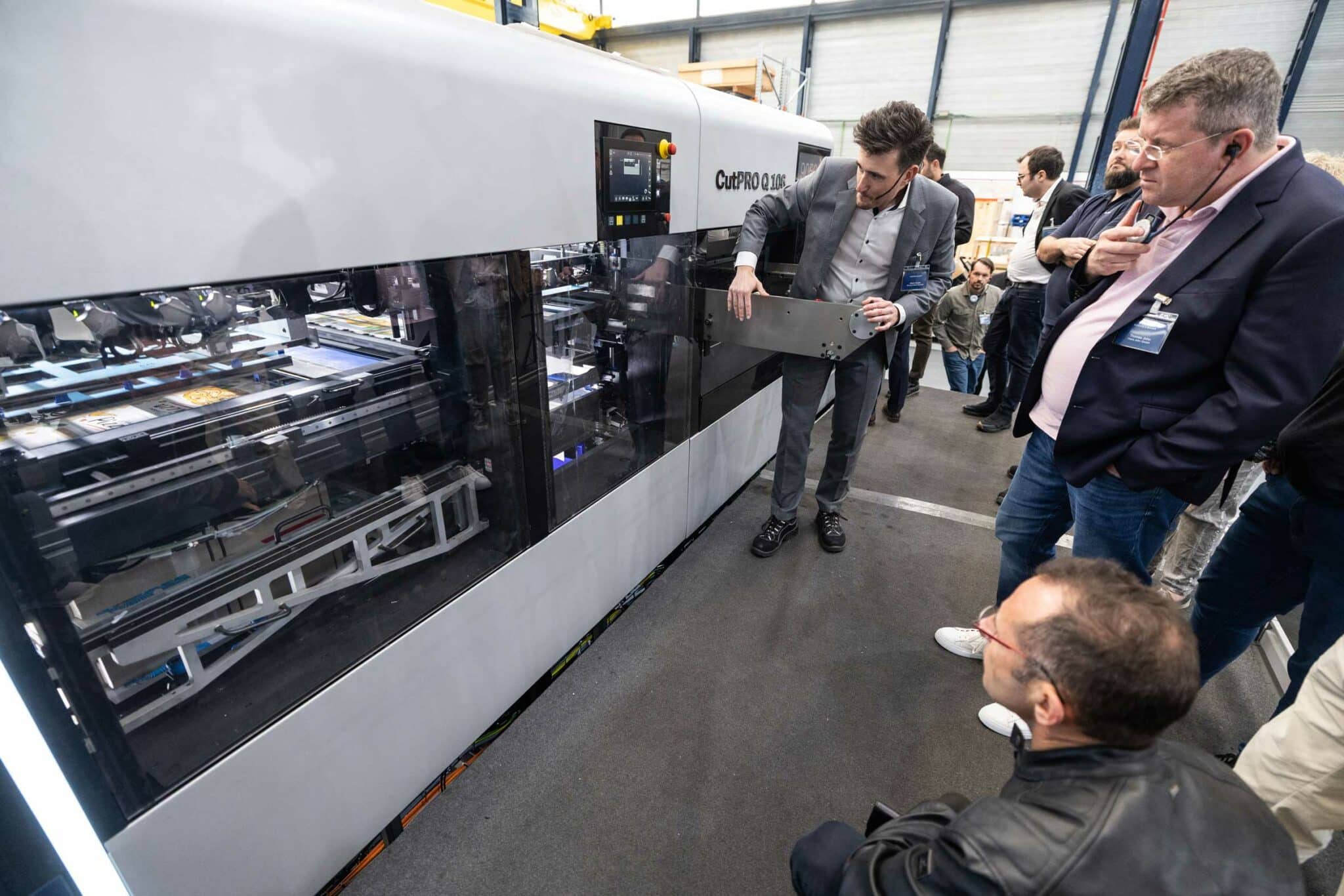 Die CutPro Q 106 SB (max. Bogenformat 760 x 1.060 mm, Produktionsleistung bis zu 9.000 Bogen/h) produzierte zwei Aufträge mit unterschiedlichen Schnitten und Formen aus den Bereichen Food und Pharma. Beim Jobwechsel konnten sich die Gäste von den kurzen Rüstzeiten und dem hohen Automatisierungsgrad überzeugen.