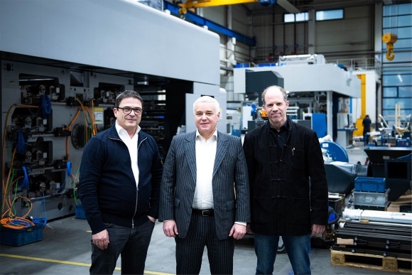 Die Montage der Flexotecnica-Maschinen wird nach Deutschland verlegt. Kapazitäten für Konstruktion, Service und Vertrieb der Systeme bleiben weiterhin in Italien. V. l. n. r.: Christoph Müller (Vorstandsmitglied Koenig & Bauer), Luigi Magliocchi (Geschäftsführer Koenig & Bauer Flexotecnica) und Hartmut Breunig (Bereichsleiter Entwicklung und Produktmanagement Koenig & Bauer). (Bild: Koenig & Bauer)
