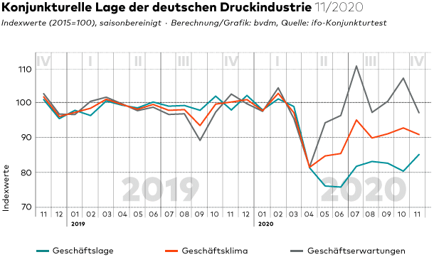 Trotz des coronabedingten Teil-Lockdowns im November 2020 kühlte sich das Geschäftsklima der deutschen Druck- und Medienbranche nur relativ leicht ab. Der vom Bundesverband Druck und Medien berechnete Geschäftsklimaindex sank im Vergleich zum Vormonat um saisonbereinigt 2,0 Prozent auf 91,0 Punkte. Dadurch erhöhte sich das Minus zwar im Vorjahresvergleich auf 9,3 Prozent, fiel jedoch deutlich schwächer aus als während des Lockdowns im Frühjahr – im April ging der Index um 18,3 Prozent gegenüber dem Vorjahresmonat zurück.