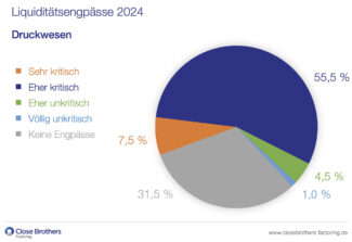 Laut einer Umfrage des Finanzdienstleisters Close Brothers Factoring aus Mainz unter 200 Branchenunternehmen kam es 2024 bei fast zwei von drei Druckereien in Deutschland (63%) zu eher kritischen oder sogar sehr kritischen Liquiditätsengpässen. Damit zeigte sich die Lage noch etwas schwieriger als im Vorjahr, als insgesamt 51% der Befragten eher kritische oder sehr kritische Liquiditätsengpässe erlebten.