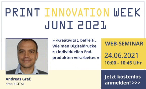 Jeder steht früher oder später vor der Herausforderung, die immer besser werdende Digitaldruckqualität in genauso perfekte Endprodukte zu verwandeln. Unter dem Motto „Kreativität, befreit“ erläutert Andreas Graf von dmsDIGITAL, wie man Digitaldrucke zu individuellen Endprodukten verarbeitet. Konkret wird in einer Kombination aus einer Digitaldruckmaschine, einer Laminier- und Folienveredelungsmaschine und einem kleinformatiger Schneidplotter innerhalb von 30 Minuten eine Kleinstserie von verkaufsfertigen, personalisierten und veredelten Schachteln hergestellt.