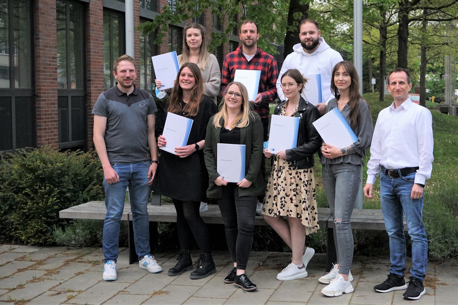 Insgesamt 18 Medienfachwirte Print+ Digital/ Industriemeister Printmedien haben im April 2022 ihre Abschlussprüfung bei der IHK Dortmund bestanden – neun davon haben die vorbereitende, berufsbegleitende Weiterbildung bei der Akademie des Verbandes Druck+Medien Nord-West absolviert. Am 22. April 2022 erhielten die „Nordwest-Absolventen” ihre Zeugnisse von Akademieleiter Michael Becker.