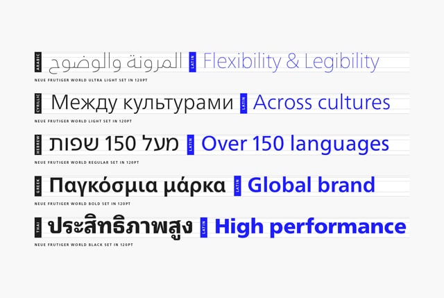 Die Monotype-Schriftfamilie Neue Frutiger World ist in zehn Schnitten verfügbar und unterstützt 150 Sprachen.