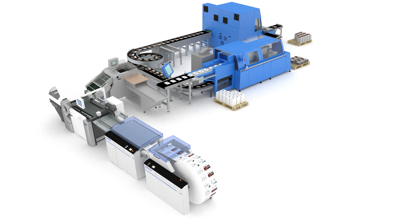 Desweiteren soll eine Hunkeler-/Heidelberg-/Palamides-/Müller-Martini-Lösung zu sehen sein, die ab Bogen und Rolle beschickt wird. Auch für kleinere Druckereien sei dies eine kostenattraktive Lösung für die Produktion bis zur Auflage 1. Auf dieser Linie werden bis zu acht verschiedene Jobs verarbeitet, die alle in Auflage 1 gefahren werden.