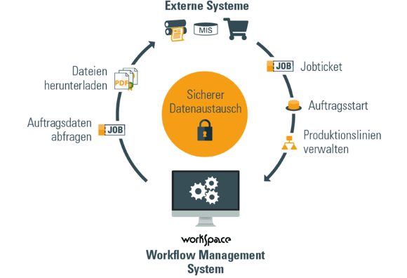 Auch beim Thema Integration stellt die neue Software Version 21.1 neue Funktionalitäten bereit. Integrationen von MIS (Management Information System) oder Webshops mit dem Workflow Management System Workspace können nun einfach und schnell abgewickelt werden. Hierbei wird die Datensicherheit beim Transfer nochmals deutlich erhöht. Anwender können dabei festlegen welche Informationen mit dem externen System ausgetauscht werden.