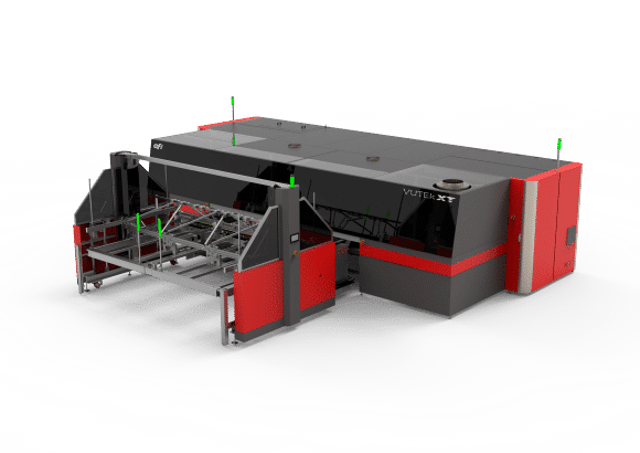 Der Vutek XT definiert die UV-Tinte mit Hilfe von LED-Lampen besonders scharf. Die Farbe wird mit UV-Licht vollständig ausgehärtet, und dies bei hohen Produktionsgeschwindigkeiten.