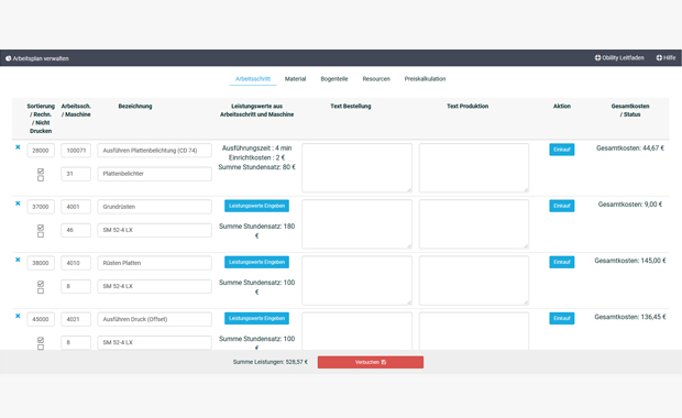 Bei all dem soll das Expertensystem laut Obility aber kein Korsett sein. Die Mitarbeiter der Arbeitsvorbereitung können die berechneten Arbeitspläne jederzeit ändern, Parameter anpassen (etwa Bogenbelegung, Zeiten und Kosten) oder zusätzliche Arbeitsschritte hinzufügen. Ändern sie in der Berechnung der Verkaufspreise manuell die Höhe der Zuschläge, zeige der Printmanager sofort die Auswirkung auf die Deckungsbeiträge an. Erfordern besondere Anforderungen in Detailfragen zusätzliche Parameter, sollen sich diese über Zusatzfunktionen manuell festlegen und bei Bedarf im Expertensystem hinterlegen lassen. Sie wären dann automatisch verfügbar.