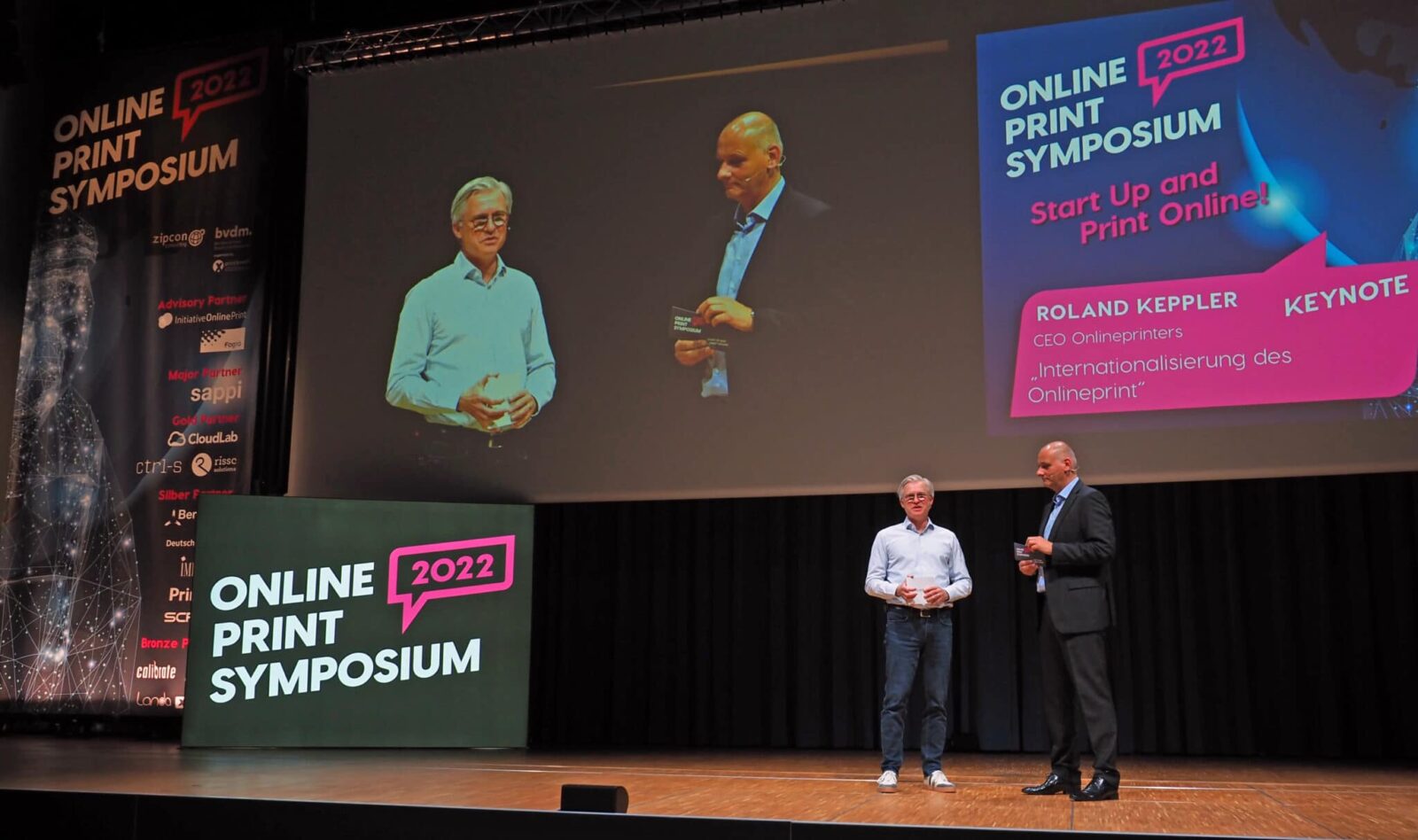 Die Keynote von Roland Keppler, CEO von Onlineprinters (li., hier mit Co-Moderator Jens Meyer), war der Auftakt zum Online Print Symposium 2022.(Bild: print.de/Gerd Bergmann)