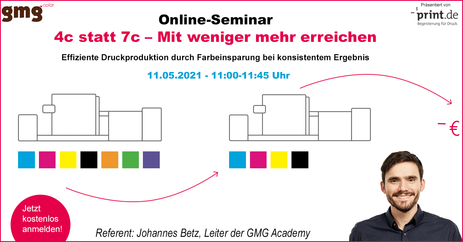 Wie Sie durch Farbeinsparung zu einer effizienteren Druckproduktion gelangen, und das bei einem konsistentem Ergebnis, erklärt Ihnen Johannes Betz am Dienstag, den 11. Mai 2021, von 11:00 bis 11:45 Uhr. Betz ist Leiter der GMG Academy und in verschiedenen Verbänden, Institutionen und Arbeitskreisen rund um das Thema Farbe und Druck tätig.