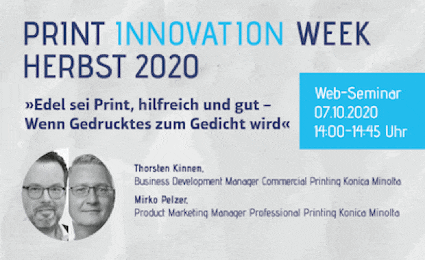 Dass die Druckveredlung eines der Topthemen in der Branche ist, wird uns jeden Tag vor Augen geführt. Schließlich bekommt der edle und gut gemachte Druck gerade in Zeiten einer wahren Kommunikationsflut und einer Verlagerung in digitale Kanäle wieder deutlich mehr Aufmerksamkeit. Wie man diese Entwicklung für sich nützen kann, erleben Sie in einem Online-Seminar (Mittwoch, 7.10., 14:00-14:45 Uhr) von Konica Minolta.