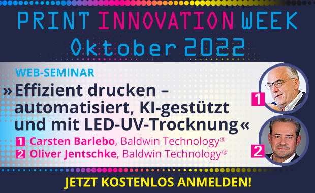 Effizient drucken durch hohe Automatisierung und KI-gesteuerte Inspektion, die Senkung des Energieverbrauchs durch Abkehr von der Gastrocknung und dazu IoT-Software für einen klaren Gesamtüberblick – das ermöglichen Systeme von Baldwin Technology, die in einem Online-Seminar der PRINT INNOVATION WEEK (Dienstag, 18. Oktober 2022 von 10:00-10:45 Uhr) vorgestellt werden.