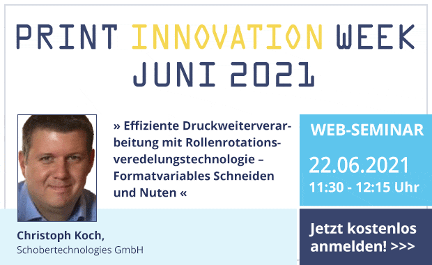 Wer nach einer technischen Lösung zur formatunabhängigen, registergenauen Verarbeitung digital bedruckter Verpackungsmaterialien und Folien sucht, sollte sich dieses kostenlose Online-Seminar des Maschinenherstellers Schobertechnologies (Eberdingen) nicht entgehen lassen. Im Rahmen der PRINT INNOVATION WEEK wird die neue Rotationsschneidmaschine RSM520HD-DIGI-VARICUT vorgestellt (Dienstag, 22. Juni, 11:30-12:15 Uhr).