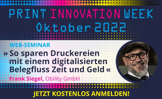Kurzfristige Änderungen, verspätete Daten, handschriftliche Notizen, fehlende Information, umständliche Archivierung – all das kommt auch heute noch in den besten Unternehmen vor. Und es wird für Druckereien durch Kleinaufträge, Fachkräftemangel und Zeitdruck zu einem immer größeren Problem. Im Online-Seminar von Obility im Rahmen der PRINT INNOVATION WEEK (18.10.2022, 13:30 – 14:15 Uhr) erfahren die Teilnehmer, wie ein digitaler Belegfluss in Druckereien Abhilfe schaffen kann.