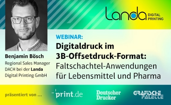 In einem kostenlosen Online-Seminar (Donnerstag, 17. November 2022, 15:00-15:45 Uhr) erhalten Sie ein Update über Landa Digital Printing. Der Referent Benjamin Bösch legt in seinem Vortrag den Schwerpunkt auf Faltschachtel-Anwendungen für Lebensmittel und Pharma. Außerdem erläutert er die jüngsten Installationen von Landa-Maschinen.