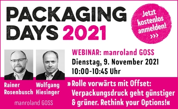 In dem Online-Seminar „Rolle vorwärts mit Offset: Verpackungsdruck geht günstiger und grüner“ erklären Wolfgang Hiesinger und Rainer Rosenbusch (manroland GOSS), welche Potenziale in der Rollenoffset-Technologie für den Verpackungsdruck der Zukunft stecken. Das kostenlose Online-Seminar findet am Dienstag, den 9. November 2021, von 10:00-10:45 Uhr statt.