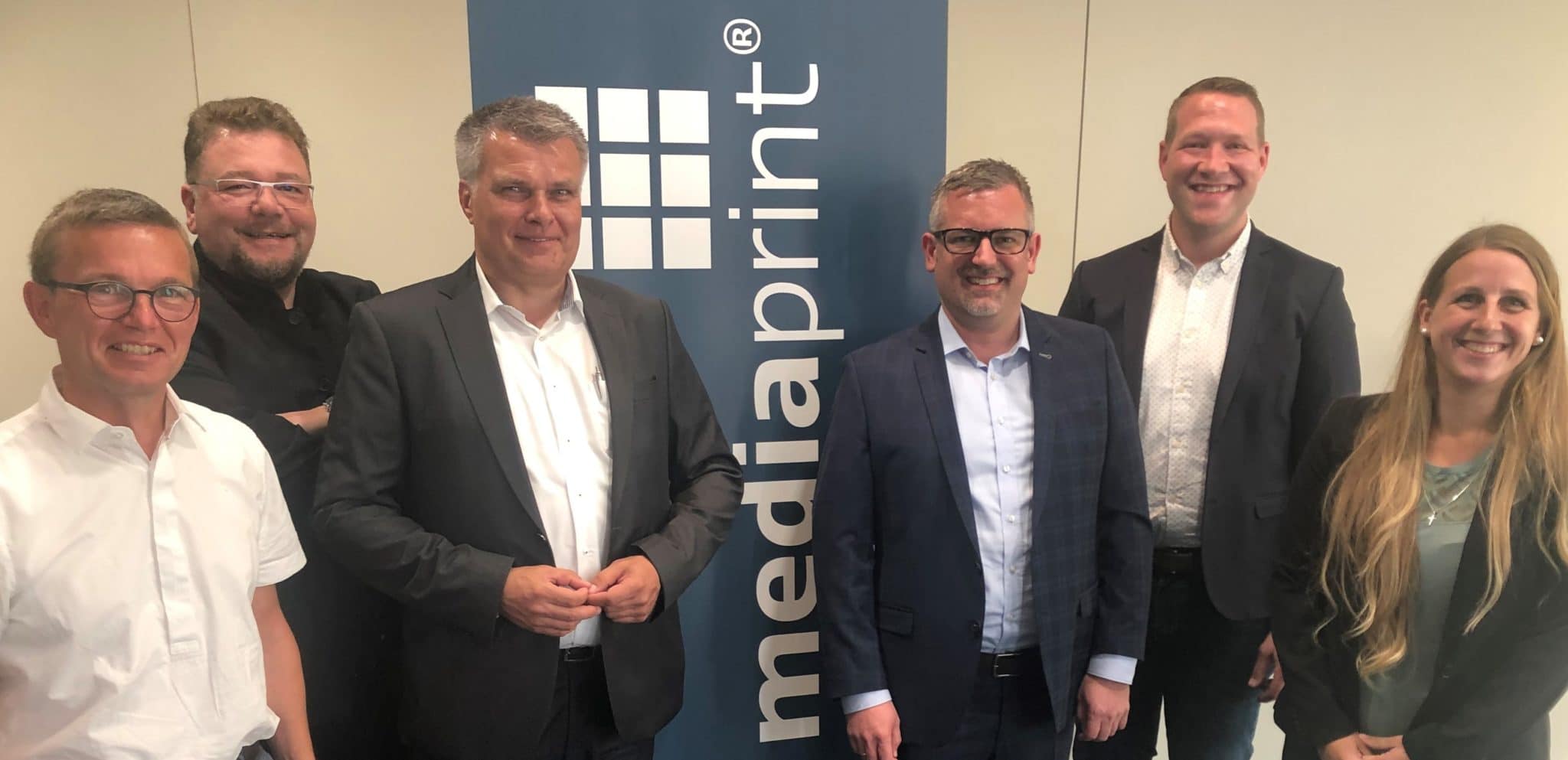 Gastgeber Mediaprint und der IOP-Vorstand sowie Vorstandsreferentin (v.l.n.r.): Carsten Schnier (Mediaprint), Bernd Zipper (Vorstand IOP), Wilhelm Soll (Vorstand IOP), Tobias Kaase (Mediaprint), Dominik Haacke (Mediaprint) und Daniela Reeck (Vorstandsreferentin IOP). Aus optischen Gründen wurde für die Fotos der Mund- und Nasenschutz abgenommen. Alle Personen auf den jeweiligen Fotos haben sich laut IOP "vorher mit Maske positioniert und vorab desinfiziert".(Bild: Quelle: Mediaprint Solutions)