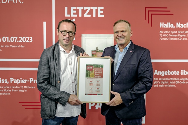 Die Handelsgruppe Rewe verzichtet seit dem 1. Juli dieses Jahres komplett auf Prospektwerbung – aus den oben zitierten Gründen. Den Abschied vom Papierprospekt indes nutzte der Konzern durchaus für Marketingzwecke: In der #umdenkbar-Galerie in Berlin übergab Rewe-Group-Vorstand Peter Maly den letzten Rewe-Papier-Prospekt an Leif Miller, den Bundesgeschäftsführer des Nabu (Naturschutzbund Deutschland e.V.) und schickte damit den letzten Prospekt buchstäblich ins Museum.