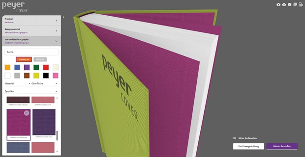 Der Anbieter von Einbandmaterialien, Peyer Cover, hat einen neuen Online-Konfigurator entwickelt. Mit Hilfe des BookDresser lassen sich am 3D-Buch-Model zahlreiche Kombinationen der hauseigenen Papier- und Gewebesorten als Einband und Vorsatz realitätsnah darstellen.