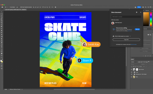 Kreative können künftig mit „Live-Co-Editing“ von verschiedenen Computern aus gleichzeitig auf Photoshop-Dokumente zugreifen und diese bearbeiten, um über Workflows hinweg in großem Umfang zusammenzuarbeiten. Das neue Tool, das von der Kreativ-Community stark nachgefragt wurde, soll die Erstellung von Inhalten erheblich beschleunigen, die Kommunikation für Designer/Designerinnen optimieren und die kreative Zusammenarbeit für Kreativschaffende, Teams und Lehrkräfte verbessern.
