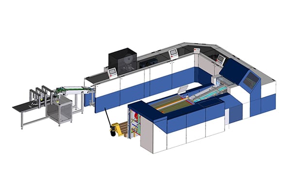 Im Anschluss an das Parallelfalzwerk folgen drei Schwertfalzwerke, wobei die beiden hinteren mit einer integrierten Bandpresse ausgestattet sind. Darüber hinaus sind beide mit einer Arbeitsbreite von nur 150 mm erstmals extrem schmal. Nach dem Falzvorgang werden die Outserts mit einem Verschlussetikettierer der Firma Multivac verschlossen. Ein Keyence Kamerasystem vermisst anschließend jedes Produkt und kontrolliert, ob die Outserts die richtige Endgröße haben. Fehlerhafte Produkte werden automatisch, während laufender Produktion, ausgeschleust. Der Verpacker am Ende der T24-Pharma-Linie wurde von Herzog+Heymann ebenfalls komplett neu entwickelt. Der Verpacker stellt die Outserts auf, presst sie zusammen und fügt sie in Trays ein. Die Trays werden automatisch zu- und abgeführt, was eine enorme Arbeitserleichterung für den Bediener darstellt.