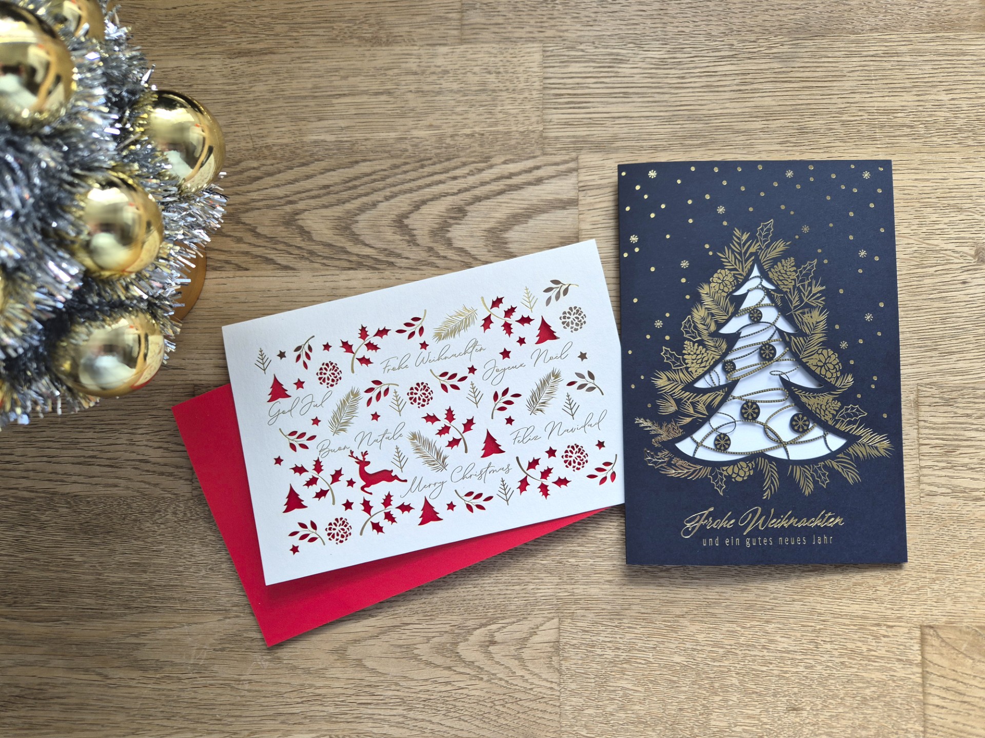 Hochwertige Weihnachtsgrußkarten des Raab-Verlags mit edlen Materialien und individuellen Motiven.(Bild: Raab Verlag)