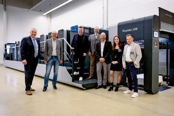 Die Geschäftspartner (v. l.) Reinhard Marschall (Geschäftsführer Koenig & Bauer Deutschland), Peter Dankesreiter und Christopher Sommer (beide Geschäftsführer der P2 MedienInvest Holding), Thomas Grübner (Geschäftsführer Elbe-Leasing), Markus von der Grinten (Koenig & Bauer Deutschland), Katja Lorenz (Elbe-Leasing) und Thomas Uehling (Geschäftsführer Raff & Wurzel) vor einer ähnlich konfigurierten Maschine wie die bestellte Rapida 106 X. (Bild: Koenig & Bauer)