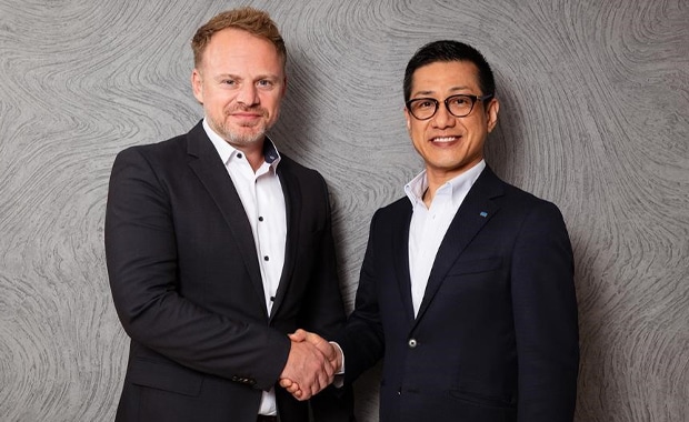 Aleksey Etin, Inhaber und CEO von UAB Veika (links), zusammen mit dem neuen Mehrheitseigner von UAB Dimense print, Kohei Tanabe, President und Representative Director der Roland DG Corporation.