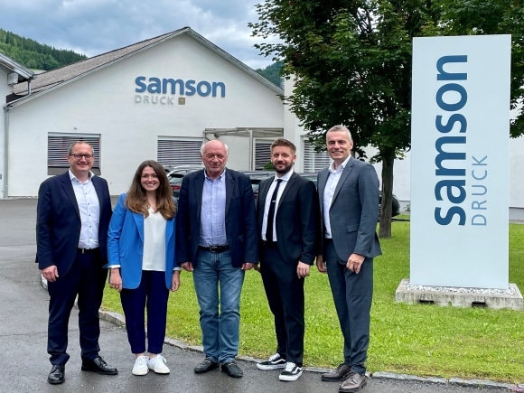 Nachdem Samson Druck, eine der größten Bogenoffsetdruckereien Österreichs, auf der Drupa in Düsseldorf bei Heidelberg eine Speedmaster XL 106 Zehnfarben 21k und eine Inkjetdruckmaschine vom Typ Jetfire 50 bestellt hat, haben der Maschinenbauer und die Druckerei diesen Schritt am Standort der Druckerei gefeiert.