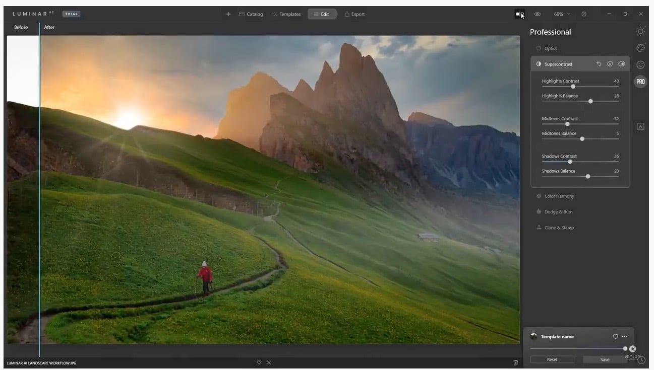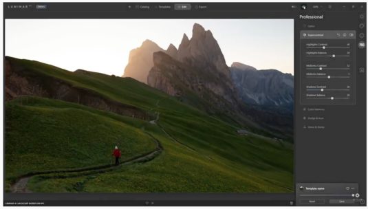 Der integrierte KI-Assistent in den Vorlagen erkennt dank 3D-Tiefenkartierung die Beziehungen zwischen allen Elementen in einem Foto. Die Vorlagen wurden entworfen, um sehr spezifische Bearbeitungen und Verbesserungen einzelner Bildkomponenten zu erreichen. Dabei kommen Werkzeuge wie BodyAI (Körperlichkeiten in Portraitbildern »verformen«), IrisAI (Augenfarbe und -funkeln verändern), FaceAI/SkinAI (Verfeinerung von Gesicht-/Hautdetails, Reduzierung von Schönheitsfehlern und Glanz auf der Haut) zum Einsatz. Mit SkyAI lässt sich auf Landschaftsbildern der Himmel vielfältig bearbeiten (oder ersetzen), AtmosphereAI schafft mit realistischen Effekten wie Nebel oder Dunst Atmosphäre im Bild, während sich die Tools AccentAI (klassische Bildoptimierungen in den Bereichen Schatten, Spitzlichter, Kontraste etc.) und CompositionAI (sorgt für den perfekten Bildausschnitt) den zentralen Bildeindrücken widmen. Auch Struktur- und Farbharmonie-Tools stehen dem KI-Bild-Editor Luminar AI zur Verfügung.