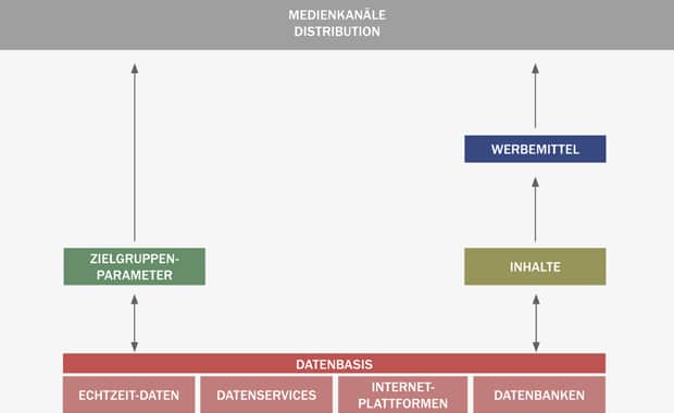 Parallel dazu werden gewünschte Zielgruppen selektiert, zum Beispiel mittels Adressdienstleistern, Haushaltsdatenbanken oder speziellen Vermarkterdaten. An diese Zielgruppen werden die Werbemittel dann ausgesteuert, etwa offline per Postwurfsendungen, postalisch adressierten Sendungen, als Beilagen in Zeitungen oder digital in Form von Online-Anzeigen auf Websites oder in Social-Media-Kanälen (siehe Abbildung unten). [4655]