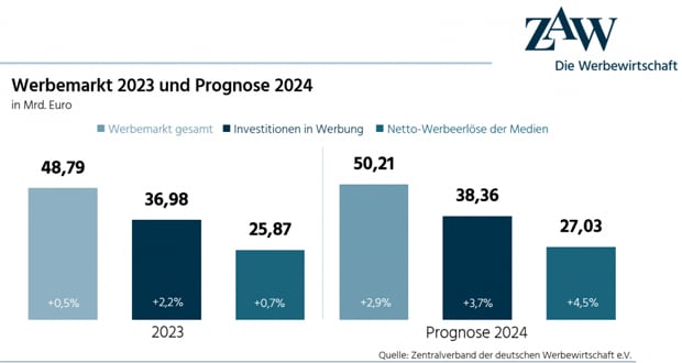 Der Zentralverband der deutschen Werbewirtschaft ZAW erwartet für das Jahr 2024 ein moderates Wachstum der Werbewirtschaft auf insgesamt 50,21 Milliarden Euro, was einer Steigerung von 2,9 Prozent entspricht. Dennoch hat die Stimmung in der Branche laut ZAW einen Tiefpunkt erreicht.