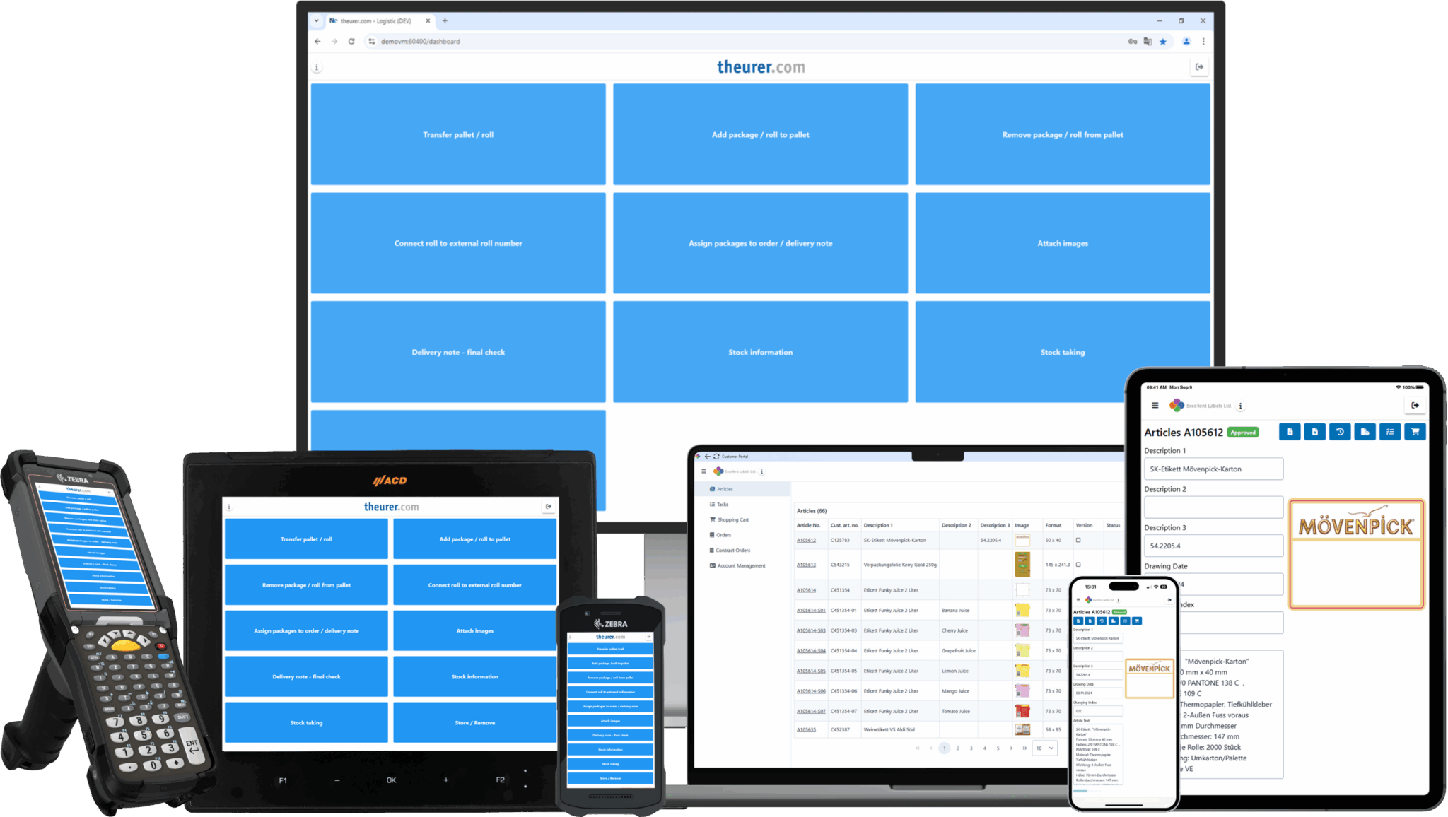 Die C3-Software von theurer.com auf verschiedenen Endgeräten: von der mobilen Logistik-App über das Web-Portal bis hin zum browserbasierten CRM.(Bild: theurer.com)