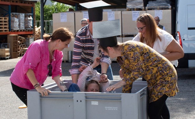 Mit dem wiederkehrenden Buchdruckergruß „Gott grüß‘ die Kunst!“ leitete Abteilungsleiter Offsetdruck und Gautschmeister Werner Wagner routiniert durch die Gautschzeremonie der ehemaligen Auszubildenden Annalena Kößler. Bei schönstem Wetter und anlässlich der 150-Jahr-Feier von Egger Druck+Medien wurde die Landsbergerin damit von ihrem „Unfug, der Fehlerhaftigkeit, der Murkserei und der Hudelei“ aus der Lehrzeit symbolisch freigewaschen – zunächst nur mit einem nassen Schwamm, ging es kurz darauf direkt in den randvoll mit Wasser gefüllten Zuber. Zuvor musste sie noch die ehrwürdige Formel „Es sei künftig mein Bestreben, stets ein tugendhaftes Leben!“ geloben. Auf das Kommando „Packt an!“ des Gautschmeisters packten erster und zweiter Packer sowie weitere Helfer die Mediengestalterin an Armen und Beinen und stellten sicher, dass sie komplett untergetaucht und damit „reingewaschen“ wurde.