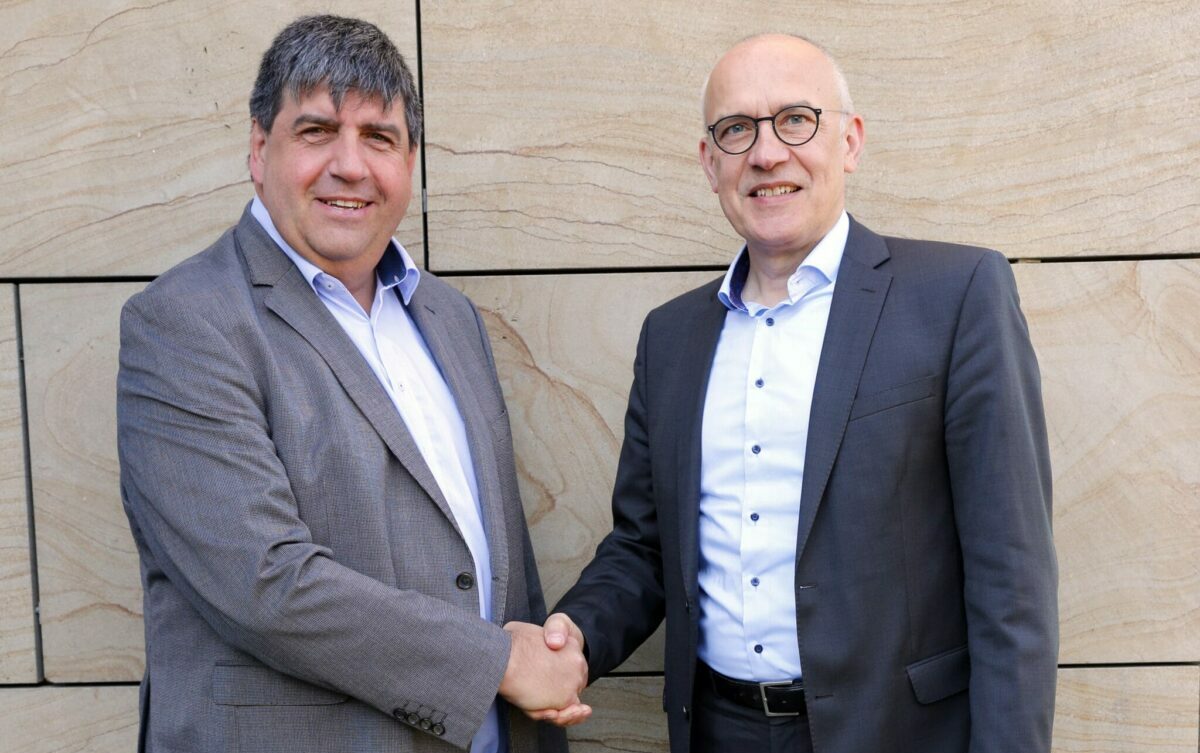 Andreas Grathwohl, geschäftsführender Gesellschafter Schoepe Display (li.), und Frank Ohle, CEO Van Genechten Packaging, haben eine strategische Partnerschaft für den Kompetenzbereich POS Platzierungen vereinbart.(Bild: Axel Bickel für Van Genechten Packaging)