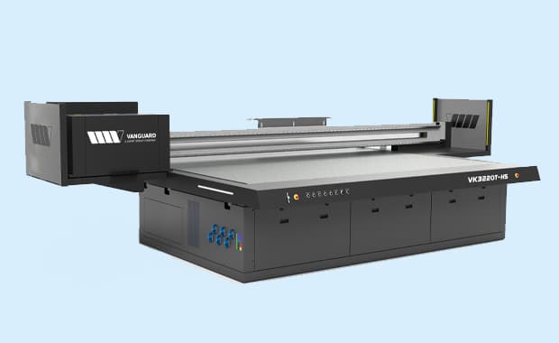Mit dem 3,2 m x 2 m großen Flachbettdrucker VK3220T-HS bedient Vanguard Europe alle Kunden im Bereich industrieller Flachbett- und Rolle-zu-Rolle-Druck mit hohem Leistungsbedarf. Der neue Großformat-Drucker verwendet bis zu drei Reihen Kyocera-Druckköpfe mit 4 Picoliter-Tropfengröße und einer Druckauflösung von bis zu 1.800 dpi und erreicht mit dieser dreireihigen Ausrichtung eine Druckleistung von bis zu 360 qm/h im Entwurfs-Modus, bis zu 162 qm/h im Produktions-Modus und bis zu 52 qm/h im Highend-Qualitäts-Modus. Das maximale Druckformat liegt bei 320 x 205 cm, die Maximalstärke zu verarbeitender Printmedien liegt bei 10 cm (und 300 kg Gewicht). Angesteuert wird der UV-Flachbettdrucker, der neben den Standardfarben CMYK optional auch mit Lc, Lm, W und V gefahren werden kann, über den Durst-Workflow. Der Großformat-Drucker soll nach Aussagen von Vanguard je nach Kundenanforderung modular erweitert werden können, beispielsweise mit zusätzlichen Druckköpfen.
