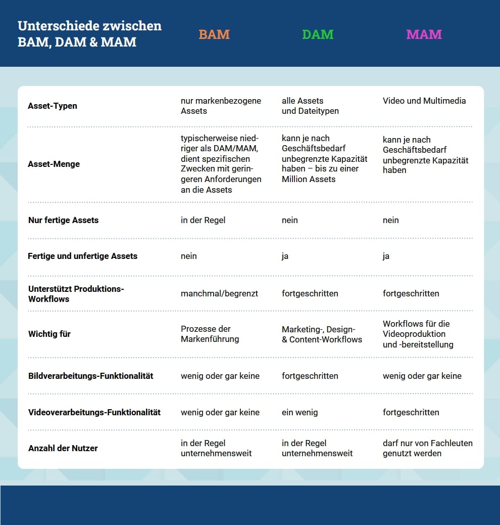 BAM-, DAM- und MAM-Softwarelösungen haben unterschiedliche Merkmale und Funktionen. Die Wahl der geeigneten Software für geschäftliche Anforderungen hängt also stark vom spezifischen Anwendungsfall ab.