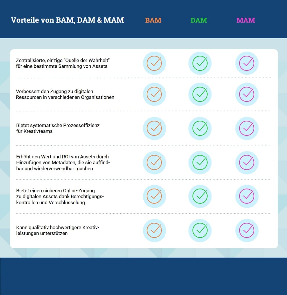 Auf den ersten Blick scheinen DAM, BAM und MAM sehr ähnlich zu sein. Es handelt sich um Softwarelösungen, die es Unternehmen ermöglichen, die bei der Erstellung von Inhalten verwendeten Assets zu speichern, gezielt zu suchen und schnell abzurufen. Sie bilden in Bezug auf Dateiverwaltung und Datenabruf eine so genannte „single source of truth“, also einen zentralen, stets aktuellen Datenspeicher. Für Benutzer wird es deutlich einfacher, seine Assets zu finden und entsprechend zu verwenden. Und dies sorgt wiederum für höhere Qualität und Konsistenz der Publikationsergebnisse. Wie unten stehende Tabelle zeigt, sind die Hauptvorteile der verschiedenen Asset-Management-Systeme erst einmal nahezu identisch.