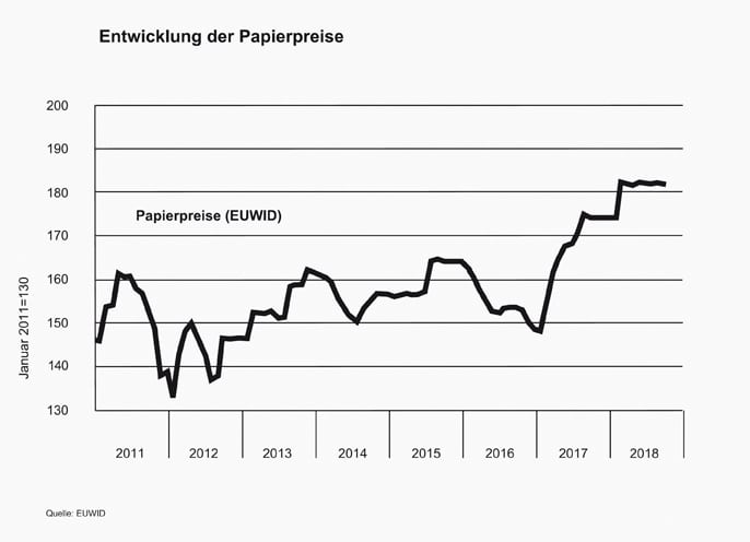 Entwicklung der Papierpreise von 2011 bis 2018(Bild: Euwid/VDW)