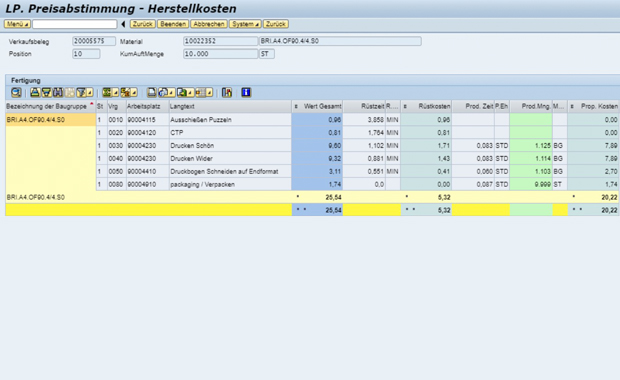 Vorkalkulationsergebnis (Ausschnitt) eines Produkts im Composingmodus. Die Rüstkosten werden nur anteilig gemäß Flächenäquivalenz berechnet, die proportionalen Kosten gemäß dem theoretischen Nutzen, der dem reziproken Wert der Flächenäquivalenz entspricht. (Bild: Dr. Lauterbach & Partner GmbH)