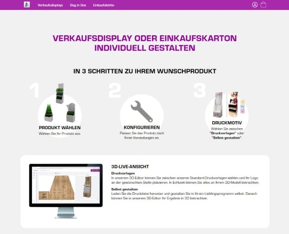 Passend zum Digitaldruck hat Straub-Verpackungen auch einen Onlineshop für Verkaufsdisplays aufgebaut. Die bequeme Customer Journey steht hier im Vordergrund – die Kunden kommen in nur drei Schritten zu ihrem Wunschverkaufsdisplay: Zunächst wählen sie die Art und Form ihres Verkaufsdisplays. Zur Auswahl stehen aktuell: Verkaufsdisplay 3 Lagen, Bag in Box 3 Liter, Pyramidendisplay sowie Einkaufskörbe bzw. Einkaufskartons. Nach der Auswahl konfiguriert der Kunde das Display nach seinen Vorstellungen. Im dritten Schritt wird das Druckmotiv festgelegt. Entweder wählt der Kunden zwischen angebotenen Druckvorlagen und individuualisiert sie mit seinem Logo oder gestaltet das Motiv komplett selbst. In Echtzeit kann er dann alles als 3D-Modell betrachten.